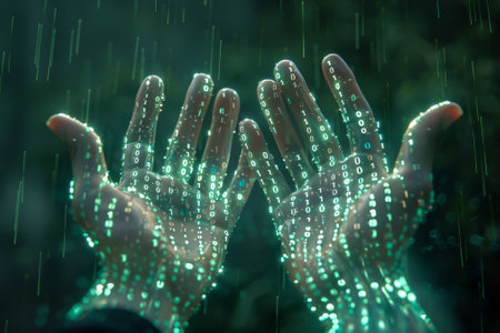 A digital hand surrounded by glowing green data streams in a futuristic concept of technology and virtual interaction. With Generative AI technology.