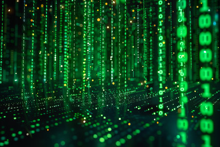 A mesmerizing cascade of glowing green binary code forms an abstract digital landscape, evoking themes of technology and data.