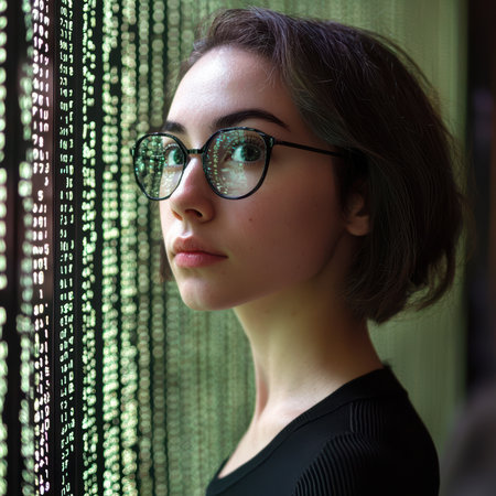 Hacker-style dark ambiance with glasses reflecting green terminal commands, evoking cybersecurity and hacking themes