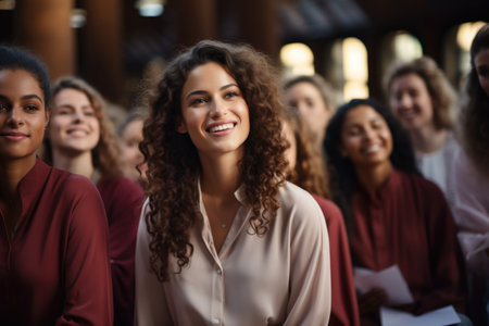 A heartwarming scene of a diverse group of young women, singing in a choir, captured in a beautifully lit traditional hall. The image exudes joy and the spirit of community.