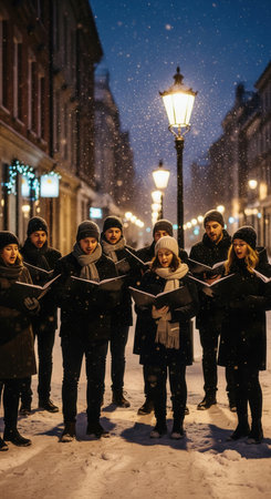 A group of singers performs Christmas carols on a snowy city street at night. This magical winter scene under a glowing streetlamp celebrates a festive holiday tradition. Perfect for Christmas cards.