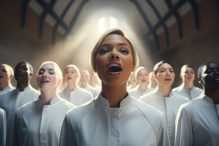 A choir in an elegant performance, with their faces harmonizing in sync and captured against a soft, blurred background that focuses on their expression