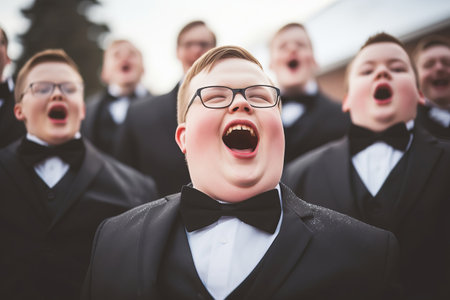 Close-up of a group of young singers harmonizing at a school concert, highlighting their enthusiasm and the clarity of their synchronized voices.