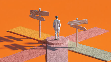 Individual contemplates career choices at an intersection with vibrant clay signs directing toward various paths under bright lighting.