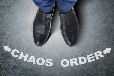 Chaos or Order symbol. Concept word Chaos or Order on wooden hearts. Businessman hand. Beautiful blue background. Business and Chaos or Order concept. Copy space