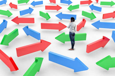 In making a choice in career or other aspects of life, a thoughtful young woman is surrounded by drawn arrows set against a pink background.