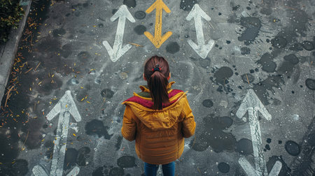 A woman stands on asphalt, contemplating two directional arrows, symbolizing choices and decisions. scene evokes sense of introspection and uncertainty