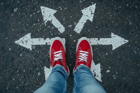 man legs in sneakers standing on road with three direction arrow choices, left, right or move forward --ar 16:9 --v 6 Job ID: bdd42d1e-ef35-4eed-b3dd-4ff1aea1dd85