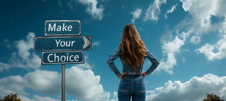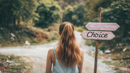 Empowered woman making a decision at crossroad with directional signpost showing the word choice