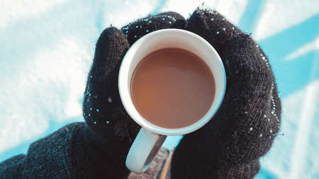 Warm cup of hot coffee warming in the hands in mittens. Womens hands on the background of snow, winter