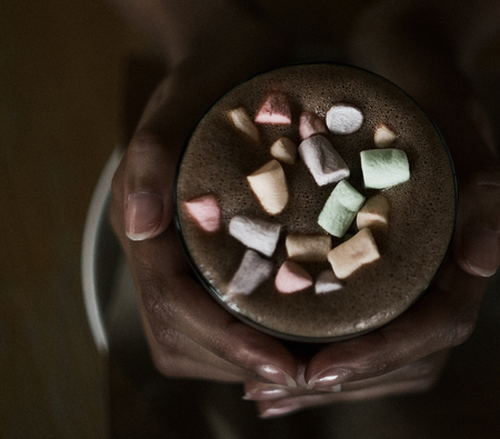 hands of an African girl holding cocoa with a marshmallow