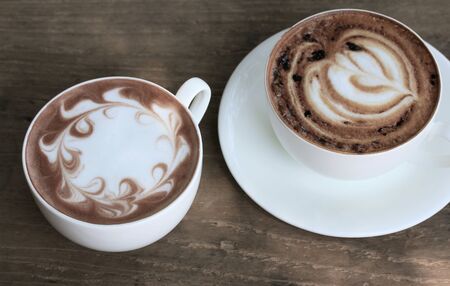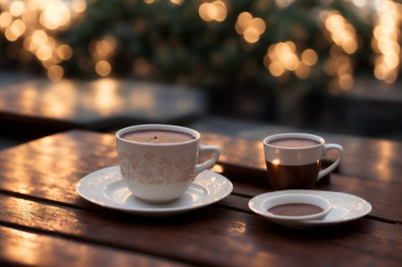 Two cups of coffee on a wooden table with bokeh background