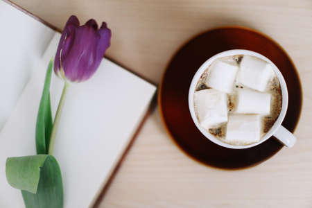 Fresh tulips with book and cup of coffee on wooden background. Spring flowers and a cup of coffee with book, spring concept. top view. flatlay