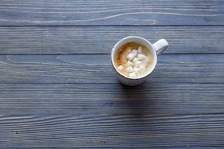 Cup of coffee with marshmallow on a wooden background.