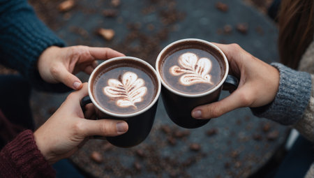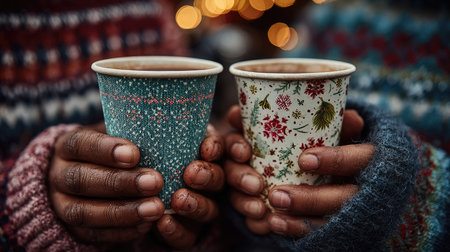 Two pairs of hands hold festive paper cups filled with a warm beverage, set against a beautifully blurred background, radiating warmth and togetherness.