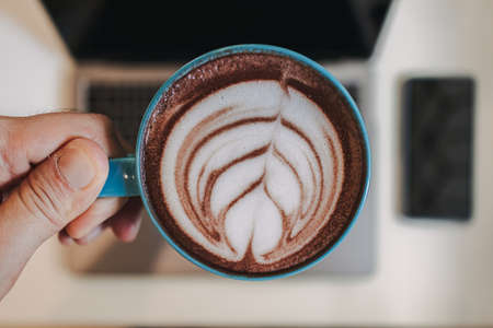 Top view of coffee latte with laptop and mobile phone.