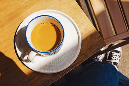 Americano with milk. Cup of coffee on the wooden table in outside cafe on the street at sunny morning