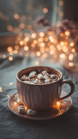 Cup of hot chocolate with marshmallows and lights on background