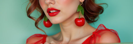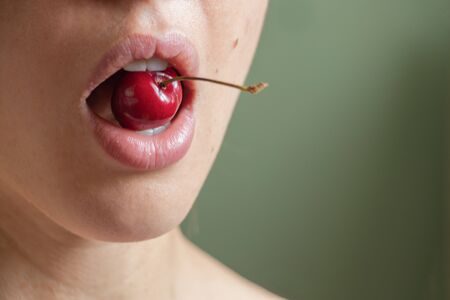 Attractive young woman eats fresh cherry, healthy berry close-up