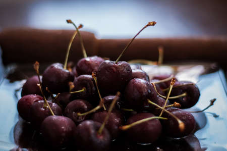 Cherries in a plate on a wooden background. Toned. Eating fresh concept.