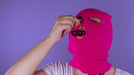 Close up of young woman in pink balaclava eats sweet cherry on purple background. Unknown female in mask enjoys ripe berries and smiles