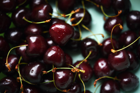 Ripe cherry texture background. Summer june fruit harvest. Free copy space, top view flat lay.