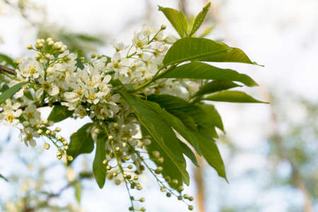 Branch of flowering bird cherry in white flowers on a spring sunny day.