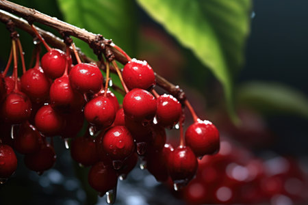 close-up of ripe coffee cherries on a branch, created with generative ai