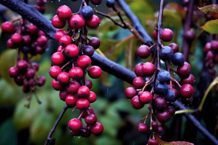 Bright red berries hang delicately on a branch glistening with raindrops in a vibrant garden.