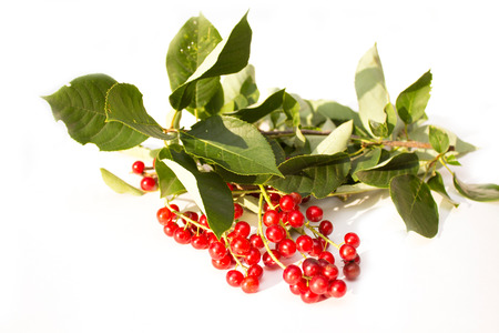 Delicious chokeberry on a twig. Isolated, Chokeberry whit green leaves
