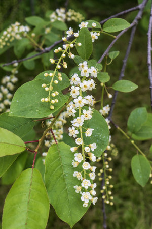 Hackberry flowering brunch, Prunus padus. Bird cherry blossom branch