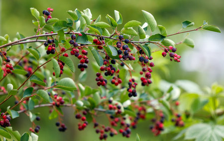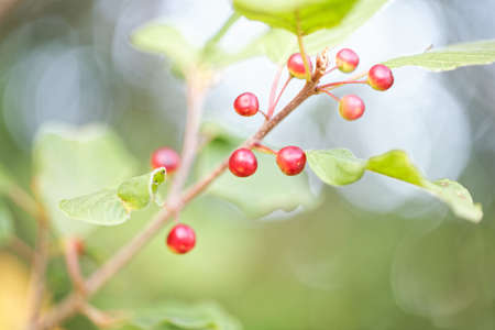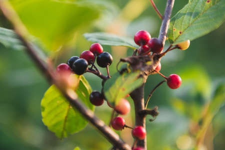 Glossy buckthorn berries or fruit growing on the bush in August.