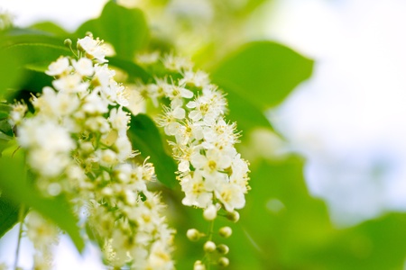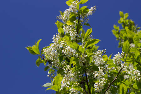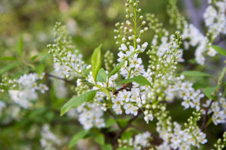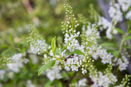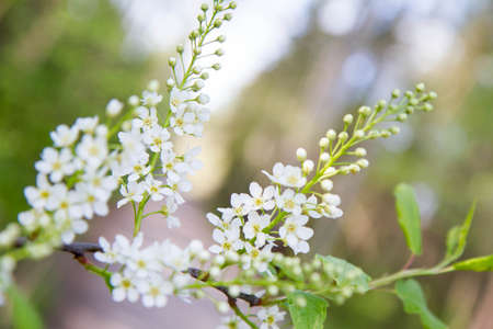 Beautiful blooming branches of bird cherry close-up. Spring background