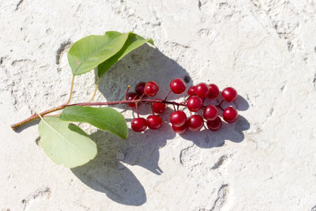A branch with red fruits of Prunus virginiana lies on a painted white stone surface. A sunny summer day.