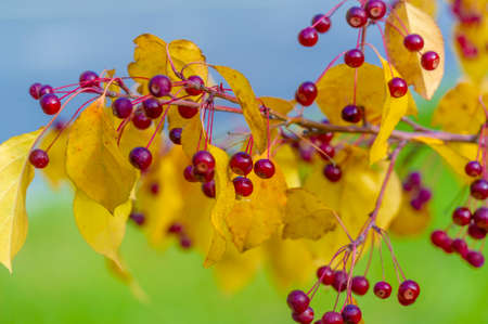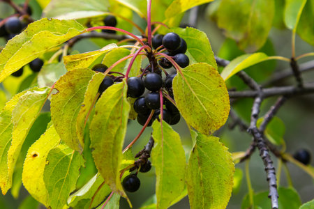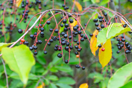 Twig of Prunus Serotina or wild cherry with fruits in autumn. Close up.