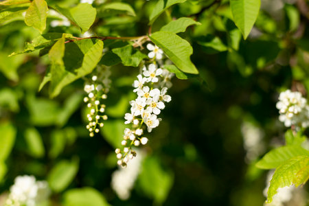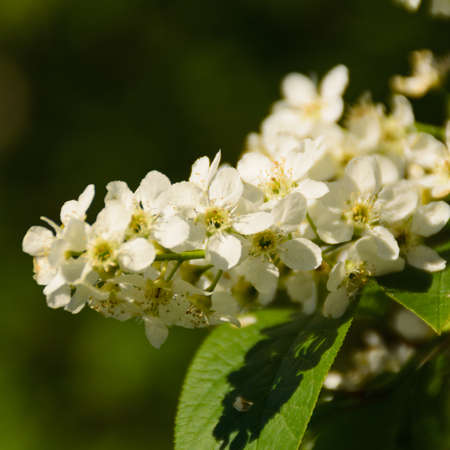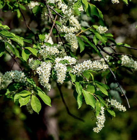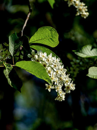 flowering bird cherry, a plant with the Latin name Prunus padus, macro, branches illuminated by the sun