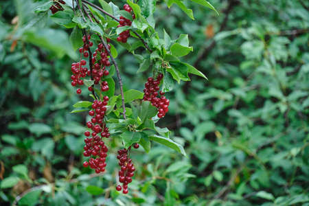 Branch with fruits of red bird cherry. Bird cherry Virginian.