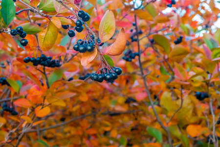 Black Chokeberry on bright autumn background leaves Bush. (Aronia melanocarpa)