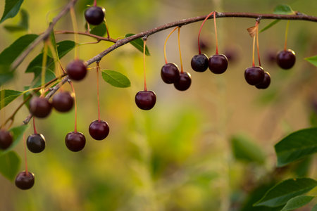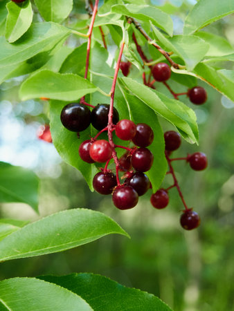 Prunus serotina, wild black cherry berries on twig closeup selective focus