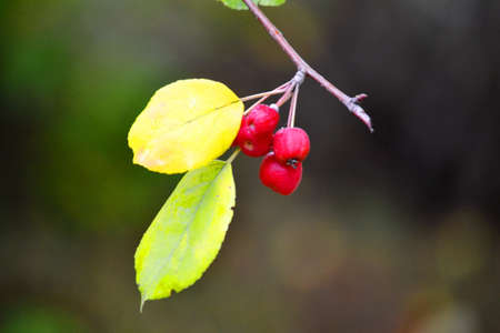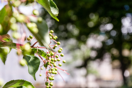 Red berries in green leaf, nature backgrounds in bokeh, viburnum berry, close-up