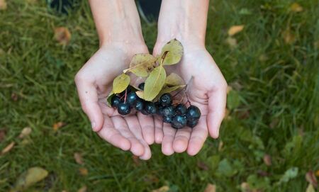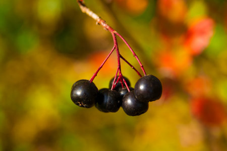 Black chokeberry ripening on branch. Aronia melanocarpa, closeup.