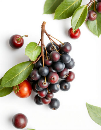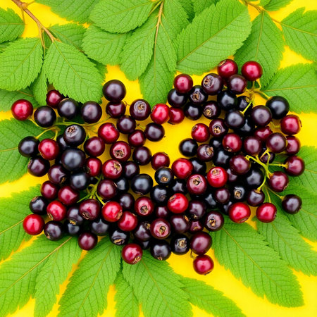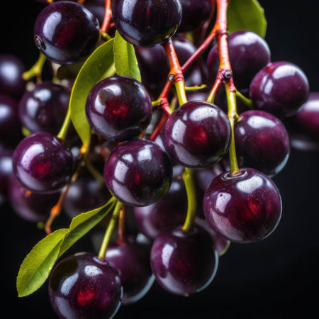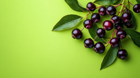 A vibrant display of fresh dark purple berries arranged with green leaves on a bright backdrop, showcasing their juicy texture and natural beauty.