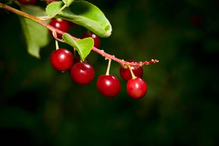A branch of felt cherry (Prunus tomentosa) with ripe berries in sunny weather. Selective focus