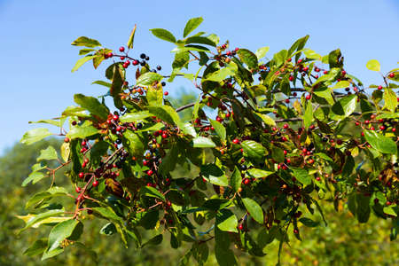 Chokecherry (Prunus virginiana) in park. Sunny summer day. Background.