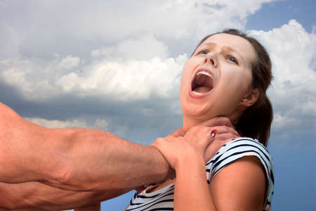 Human trafficking concept, End to violence against women, Scared woman with man's hand covering her neck, Victim of domestic violence.