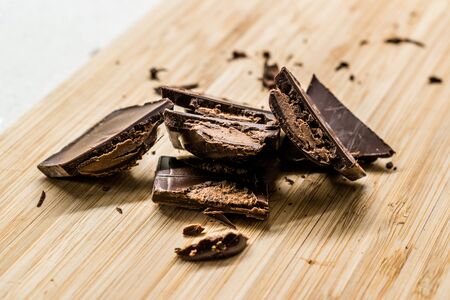 Ganache Filled Chocolate Bar Pieces on Wooden Board Ready to Eat. Sweet Snacks.