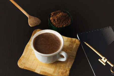 A cup with a hot cocoa drink and a notebook with a pen lying next to it.