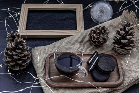 Cup of coffee with chocolate chip cookies on wooden tray. Concept for a tasty snack, Selective focus, Oblique view from the top.