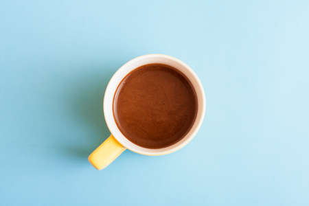 A cup of hot coffee in pastel colors. Turkish coffee in a yellow mug on blue background.