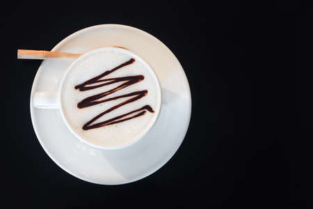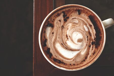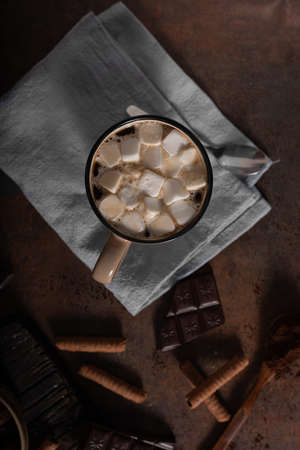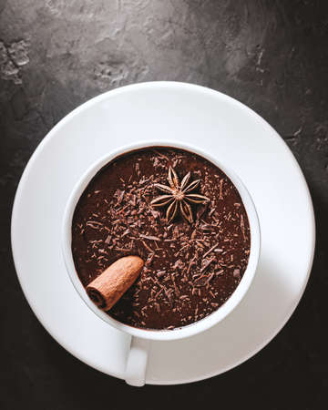 Hot chocolate drink in a white cup with cinnamon stick and star anise on textured dark background, top view with copy-space.